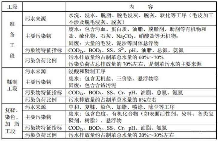 皮革废水:量大而成分复杂 皮革生产用水量大,而生产过程产生的废水也是其主要的污染物排放来源。以动物皮为原料的制革工艺采用大量的化工原料,制作过程中,动物皮中的脂肪和蛋白质会同这些化工原料一起进入到废水中,使得皮革加工所产生的废水中不仅有COD、氨氮,还有重金属、油脂等,成分十分复杂,具体见表1。